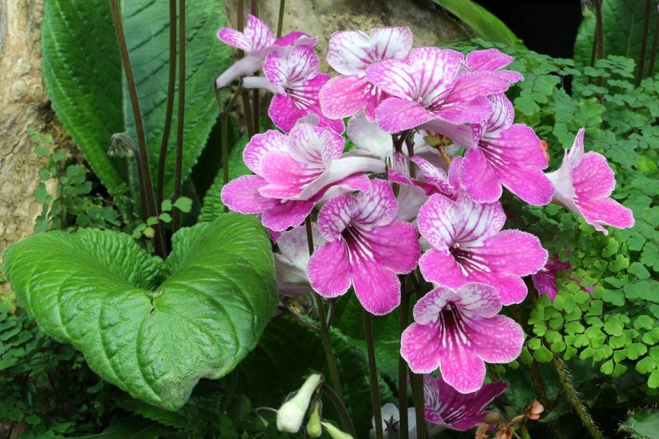 Streptocarpus can be annuals, perennials or subshrubs, with usually wrinkled, lance-shaped to rounded leaves and clusters of tubular to trumpet-shaped flowers with 5 spreading lobes, often borne throughout the year