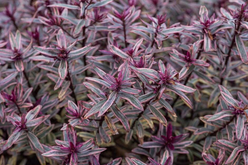 A compact, bushy evergreen shrub to around 60cm high, with narrow, grey-green leaves edged with white, and tinted bright purple in winter. Spikes of purple flowers are sometimes produced in summer, though this cultivar is grown mainly for its foliage