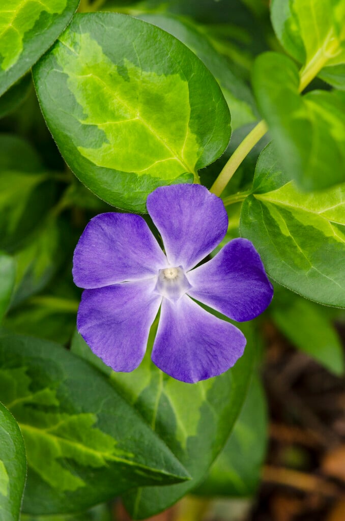 Vinca can be evergreen subshrubs or herbaceous perennials, with simple, paired leaves and solitary, 5-lobed, salver-shaped flowers in the leaf axils