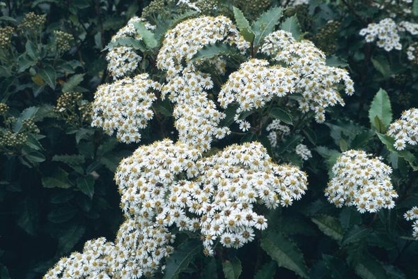 Olearia × haastii , O. ilicifolia , O. macrodonta AGM, O. phlogopappa 'Comber's Blue' , O. traversii (e) all