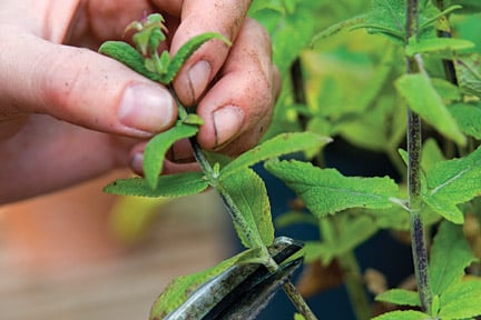 2. Use a knife to prepare the final cuttings. Trim each cutting just below a leaf and carefully cut or pinch off the leaves from the lower half. Only use material from the shoot tips. Each cutting should be around 5-8cm (2-3in) in length.