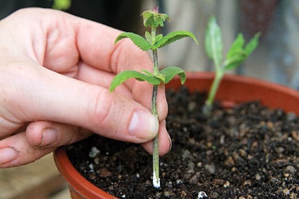 3. Dip the base into a rooting hormone compound and insert into a 15cm (6in) pot of gritty, cuttings compost five to eight cuttings per pot. Water in and place in a propagator or cover with a clear, plastic bag. Keep at room temperature until rooted and overwinter in a frost-free place.