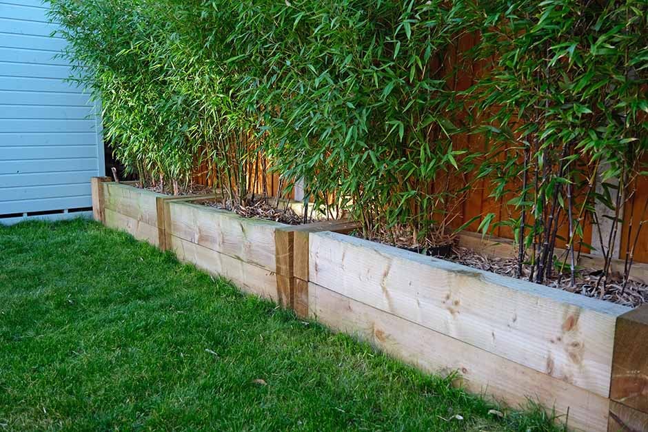 - Insert a physical barrier when planting – position your bamboo and dig a trench at least 60cm (2ft) deep around it, leaving a sufficient distance to allow your bamboo some space to grow outwards. Insert a physical barrier into the trench. Purpose made bamboo root barriers are easiest to handle and insert. Edges should overlap by at least 30cm (1ft) and be bonded with appropriate mastic. The barrier should extend above the soil level by at least 7.5cm (3in) to prevent rhizomes growing over it. Paving slabs and corrugated iron are sometimes used, but care is needed to avoid gaps that rhizomes could grow through.