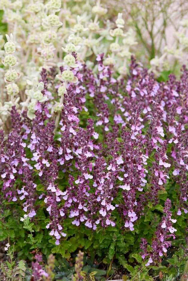 Teucrium is under-used as a box alternative. The flowers produced when the hedge is allowed to grow a little between clippings make it not only a very attractive option, but also a great choice for pollinators.