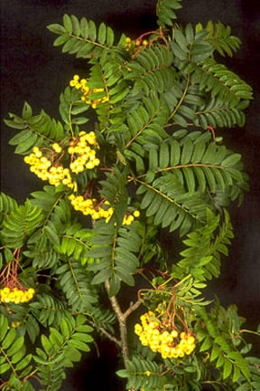 S. 'Sunshine' : (*) large dense clusters of yellow fruits. Height 8m (26ft). Spread 6m (20ft)