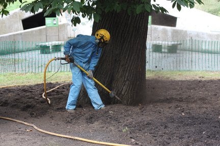 Use of compressed air-tools (air-spade, Terravent or Terralift) can be beneficial for relieving compaction in the main rooting area and for removing excess soil from around base and root collar of trees and shrubs. Such treatments may be worth considering if trying to save a high value or hard to replace tree. An initial assessment by a tree specialist will consider the tree’s safety and then the likely success of remedial work.