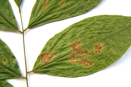 Irregular dark brown marks and blotches, usually with a yellow margin, are a symptom of infection by the fungal disease powdery mildew . On most other types of plant this disease produces conspicuous white fungal growth on the leaves, but on wisteria it can be very difficult to see any growth at all on the blotches (without using a microscope).