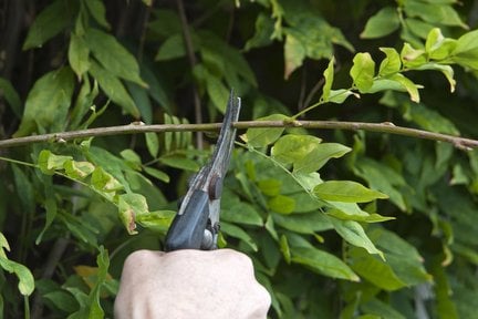 Drastically shortening back long branches, removing sections of older stems to just above a strong young branch or growth shoot lower down, or cutting completely back to a main branch, or even to ground level may be necessary. A careful, unhurried approach is needed if larger, thicker branches are to be removed and where a branch is twining it may be necessary to trace back and mark it at intervals with string before removing it. The end result should be a skeleton frame work of reasonably well-spaced branches.