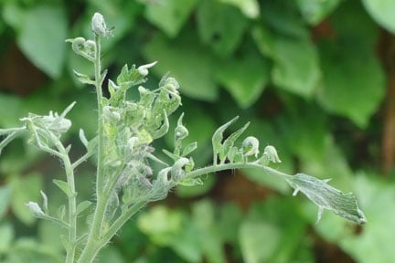 Roses, tomatoes, potatoes and vines are particularly sensitive to hormonal weedkillers. Symptoms include: