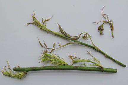 - Twisted or distorted leaf stalks