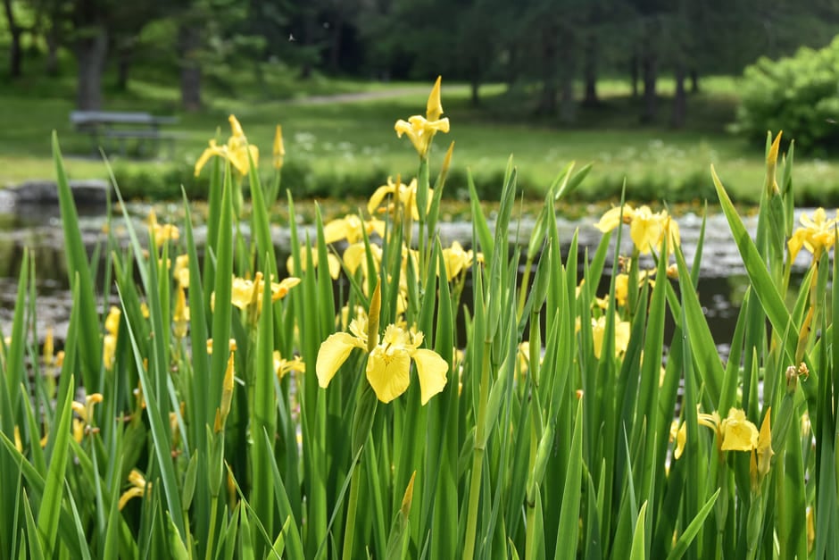 Large garden pond species such as the native  Iris pseudacorus  (yellow flag iris) may also be too vigorous in small ponds, unless sections are regularly removed.