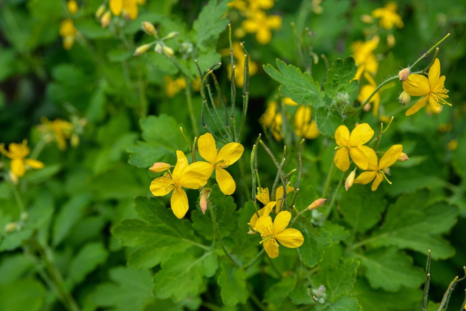 Greater celandine’s botanical name is Chelidonium majus; it is also known as swallow wort and the celandine poppy