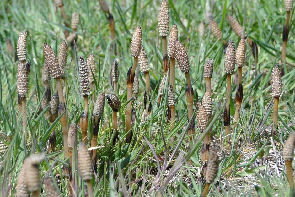Horsetail’s botanical name is Equisetum arvense; it is sometimes called field horsetail or mare’s tail