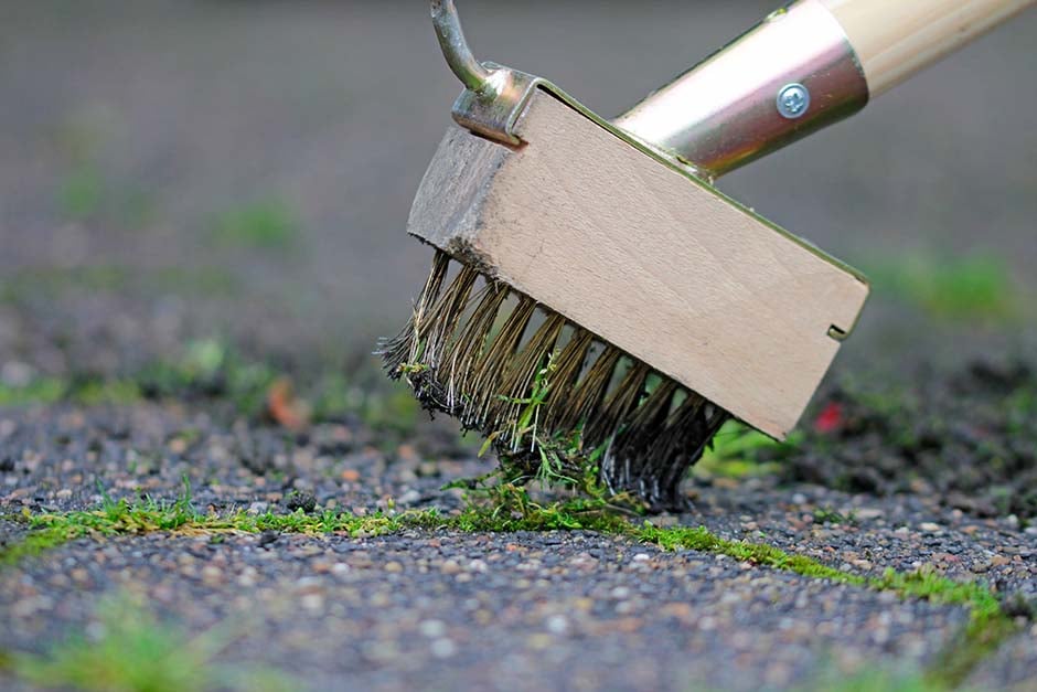 - Scrub off weeds – use a paving brush with angled wire bristles to scrub mosses , weed and debris from cracks and paving joints.